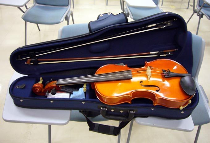 せっかくなんでこのカテでは楽器の紹介でもしようと思います。写真は随時変更の恐れアリw んで、このビオラです。自分にとって最初のビオラ。もちろんサークル楽器です。値段は五万円ぐらいらしいとのことですが、細かい値段は不明。サークルには3つビオラがありますが、このビオラが一番響きが良く、代々我らのサークルのビヨラーたちが使い続けています。使用頻度が高いためか、値段の割にはかなり良いとのこと。1999年製、copy of J.P.Mazzineと刻印がされており、家の50cm定規で測ったところ405mmサイズっぽいです。日本で30万円未満あたりで売られてるものによくみられる395mmに比べたらちょっと大きいっぽい。先輩のビオラを持ったときはやや小さめに感じられたので、あれが395mmでしょうか。でも響きは先輩のビオラのほうがずっと上w しかしそろそろこの楽器ともお別れです。もうすぐマイ楽器を買う予定なのでw